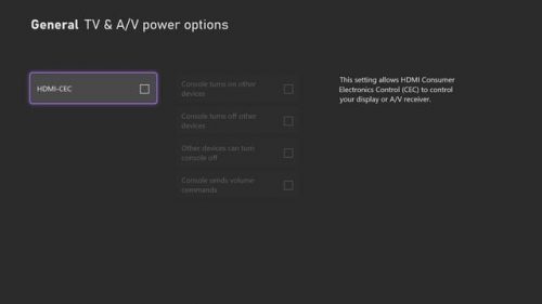 با صرف نظر از این قابلیت و انتخاب گزینۀTv And A/V Pover Options میتوانید به قابلیتی که مد نظرتان بود برسید. و سپس با فعالکردن گزینه HDMI_CEC میتوانید این قابلیت را برای ایکسباکس سری اس و ایکسباکس سری ایکس فراهم آورید. این اقدامات باعث روشن و خاموش شدن هم زمان دستگاه تلویزیون یا مانتور با کنسول بازی میشود. توجه داشته باشید که با انجام این کارها برای فعالکردن این گزینه باید کنسول بازی سری ایکس را برای یک بار Restart کنید تا تغییراتی که اعمال کردهاید عملی شوند.
