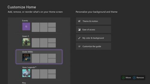 شروع به چیدن کنید. توجه داشته باشید که برخلاف بخش شخصی سازی کردن منوی اصلی راهاندازی اولیۀ ایکسباکس سری ایکس، کاربران این کنسولها در این قسمت نمیتوانند گزینهای را حذف کنند. فقط میتوانند گزینههای موجود را جابهجا کنند.