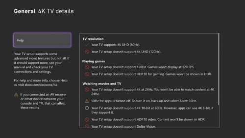 باید در نظر داشته باشید که این بررسی برای اطمینان بیشتر از بهترین کیفیت تصویر انجام میشود چرا که در بیشتر موارد کنسول بازی بهترین کیفیت ممکن را برای پخش در نظر میگیرد. در مرحلۀ بعد اگر در نشان دادن بهترین کیفیت دچار مشکل شدید بهتر است برای بهبود و حل این موضوع به قسمت General 4K TV Detailsدر بخش تنظیماتی که قبلاً توضیح دادیم رفته و اگر با اخطار و خطایی که در بخش عکس این قسمت میبینید مواجه شدید باید به شرکت سازنده برای رفع مشکل مراجعه کنید. شما برای داشتن بهترین کیفیت ممکن باید از کابل و تلویزیونی استفاده کنید که قابلیت پشتیبانی از تکنولوژی HDMI 2.1را داشته باشد.